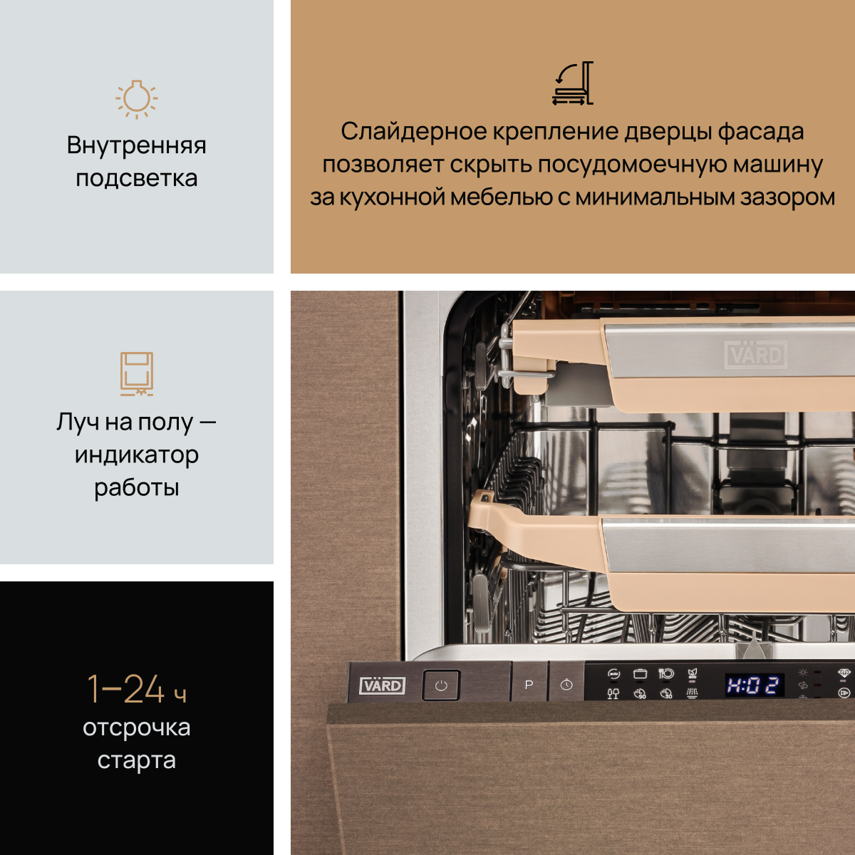 автоматическое открывание дверцы по завершении цикла, внутренняя поверхность из нержавеющей стали, дисплей, использование средств 3 в 1, открывание без ручки, подсветка камеры, проточный водонагреватель, регулируемая по высоте корзина для посуды, сенсор чистоты воды, таймер отсрочки, Автоматическое открывание двери, Внутреннее освещение, Датчик прозрачности воды, Звуковой сигнал, Отключение звукового сигнала, Отсрочка запуска, Поддон для столовых приборов, Половинная загрузка, Регулировка высоты корзин, Съемные контейнеры для столовых приборов, Таймер, защита от протечек