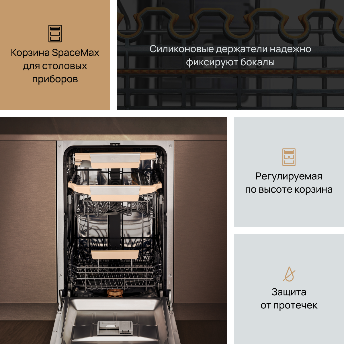 Слайдерное крепление фасада; Антибактериальный фильтр; Замачивание; Увеличенная третья корзина Space Max;