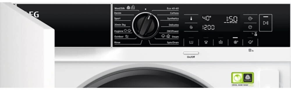 быстрая стирка, дополнительное полоскание, ежедневная стирка, отжим, полоскание, предварительная стирка, стирка верхней одежды, стирка деликатных тканей, стирка паром, стирка синтетики, стирка спортивной одежды, стирка хлопка, стирка шерсти, 20 мин 3 кг, OKOPower, гигиена, дeним, деликатные ткани, пар, шерсть/шёлк, эко 40-60 °С