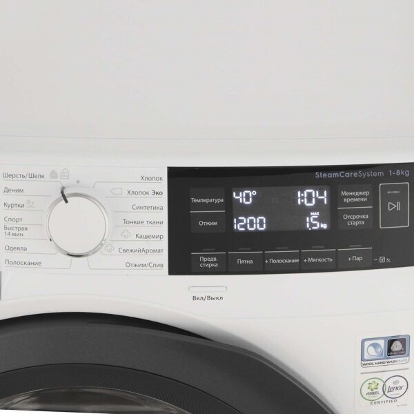 быстрая стирка, гипоаллергенная стирка, дополнительное полоскание, ежедневная стирка, замачивание, отжим, отмена отжима, полоскание, предварительная стирка, стирка верхней одежды, стирка деликатных тканей, стирка джинсов, стирка паром, стирка синтетики, стирка спортивной одежды, стирка хлопка, стирка шелка, стирка шерсти, удаление пятен, экономичная программа, Вкл/Выкл, Деликатная стирка, Деним, Куртки, Пуховые одеяла, СвежийАромат + Пар, Спорт, Стирка за 14 мин, Хлопок Эко, Шерсть/Шелк, деликатная стирка, деним, куртки, пуховые одеяла, свежий аромат + пар, спорт, стирка за 14 мин, хлопок эко, шерсть/шелк