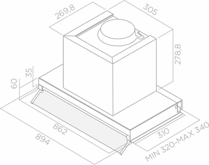 Комплектация : Инструкция по монтажу и эксплуатации, монтажный комплект, сетевой кабель без вилки (находится внутри вытяжки)