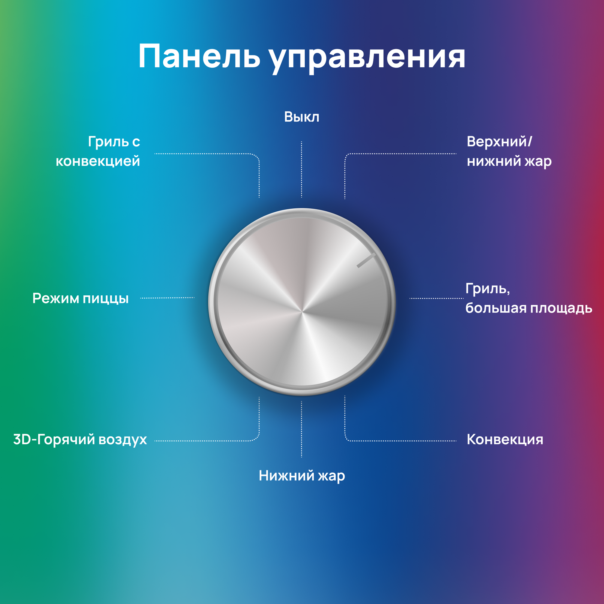 большой гриль, верхний нагрев, верхний нагрев + нижний нагрев, гриль, гриль + конвекция, конвекция, нижний нагрев, Гриль + нижний нагрев, Нижний нагрев + Турбо (Пицца)