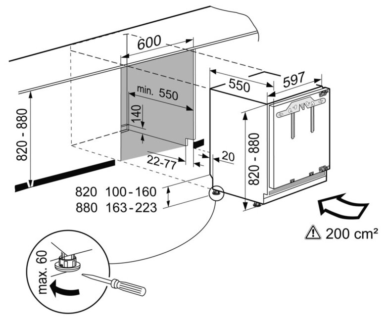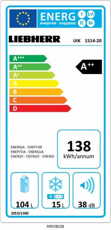 встраиваемый под столешницу холодильник. полезный объем холодильника 119 л. холодильное отделение:. регулируемый диапазон температур: от +2 °C до +9 °C. лоток для яиц: вариабельный. управление: кнопки. индикатор температуры. жесткое крепление двери. макс. вес фасада: 10 кг. сторона открывания двери: справа для сменной двери. угол открывания двери: 115°. регулируемые по высоте ножки: 4. вентиляция через цоколь. тип штекера: Евро. соединительный кабель (длина): 2 м. годовое потребление энергии 126 кВтч.