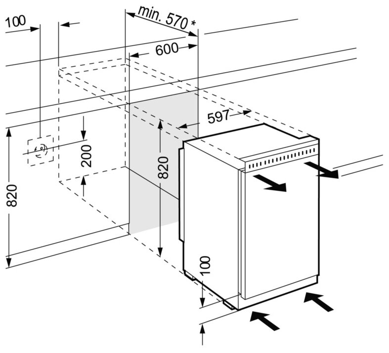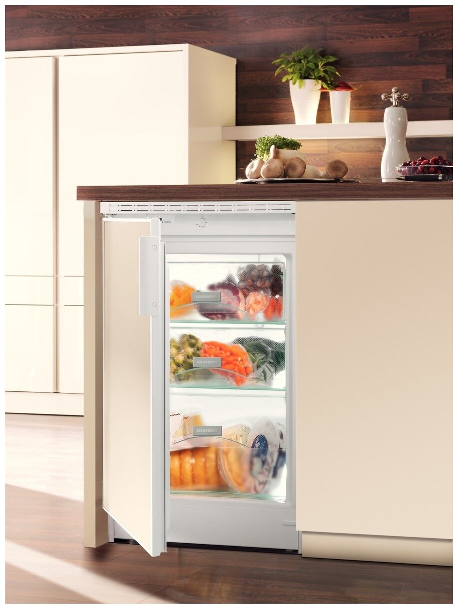 морозильная камера устанавливается в нишу под столешницу. Производителем не предполагается возможность установить фасад кухонного гарнитура на дверцу морозильной камеры! Установка цоколя также невозможна.