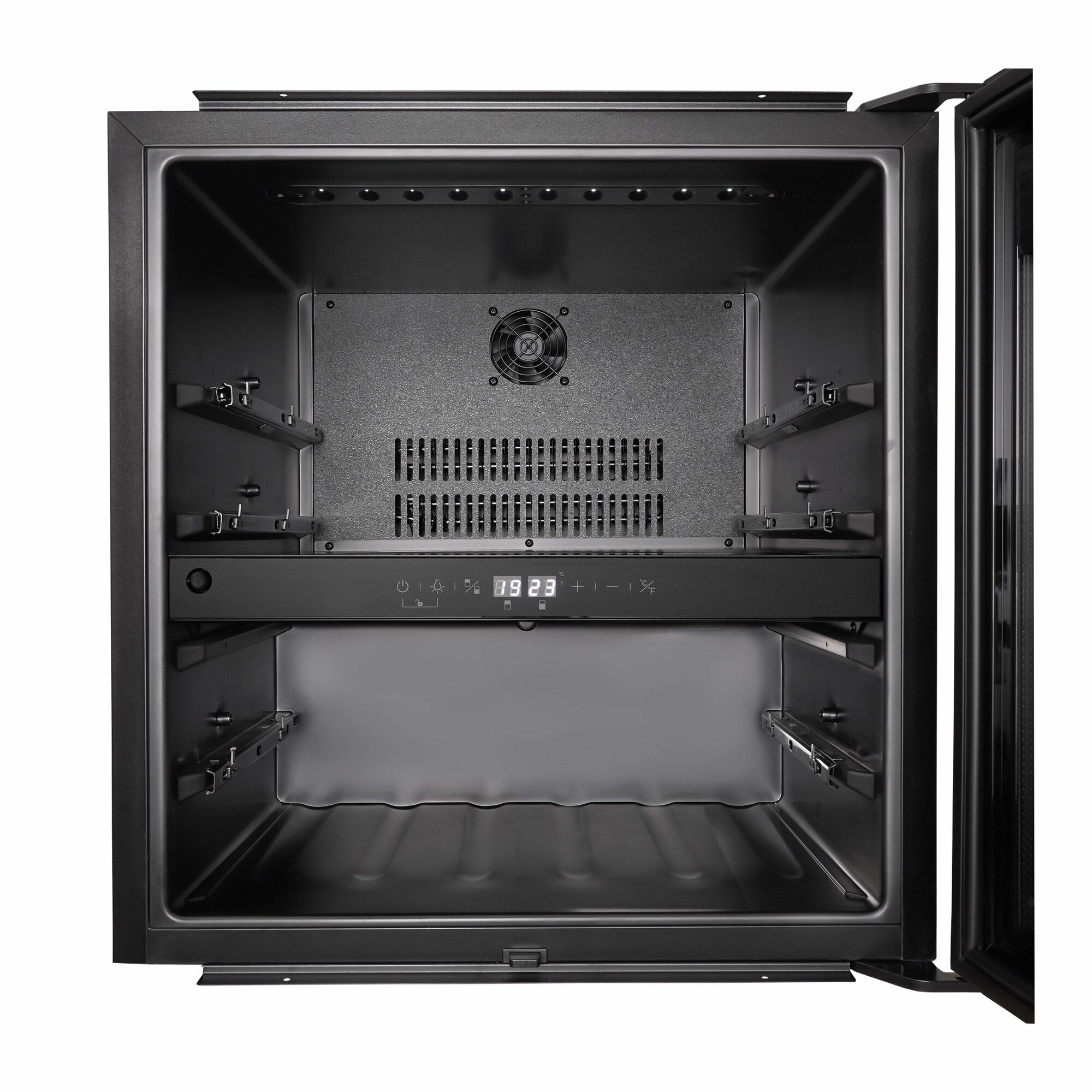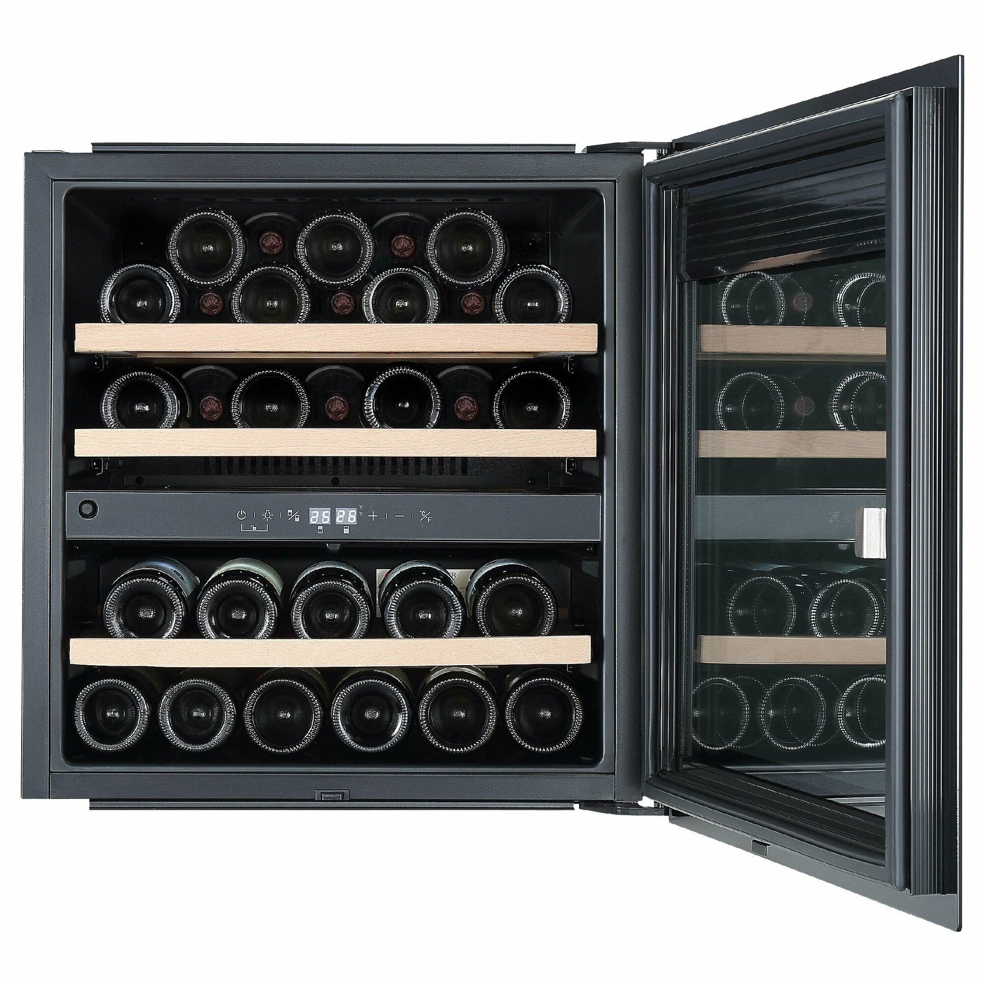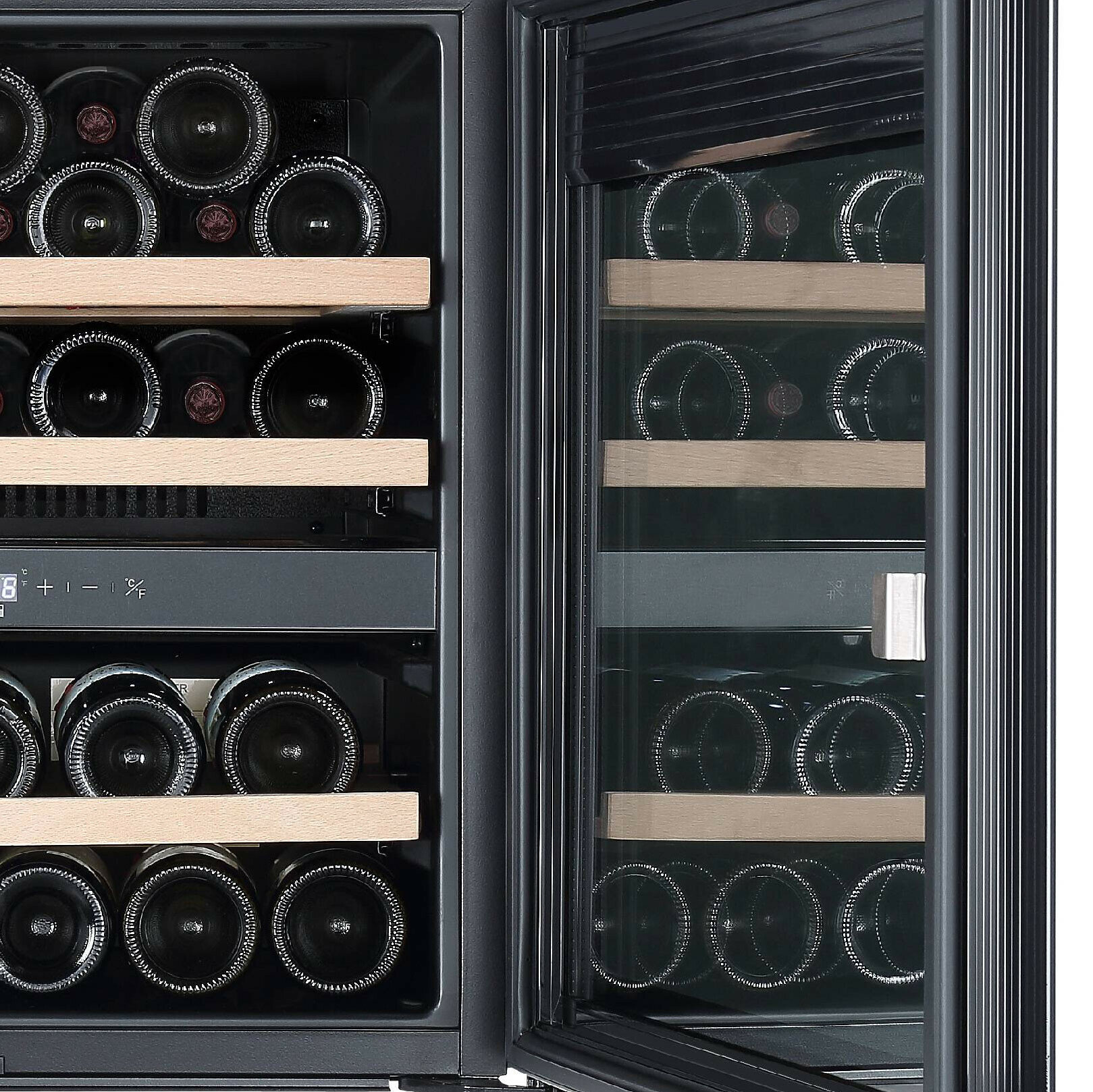 дисплей, Антивибрационная система, Винная камера, Вправо, Дизайнерское оформление, Открывающиеся вправо, Светодиодная подсветка, Сенсорное открывание дверей, Сенсорное открывание двери 2 температурные зоны, Система контроля влажности