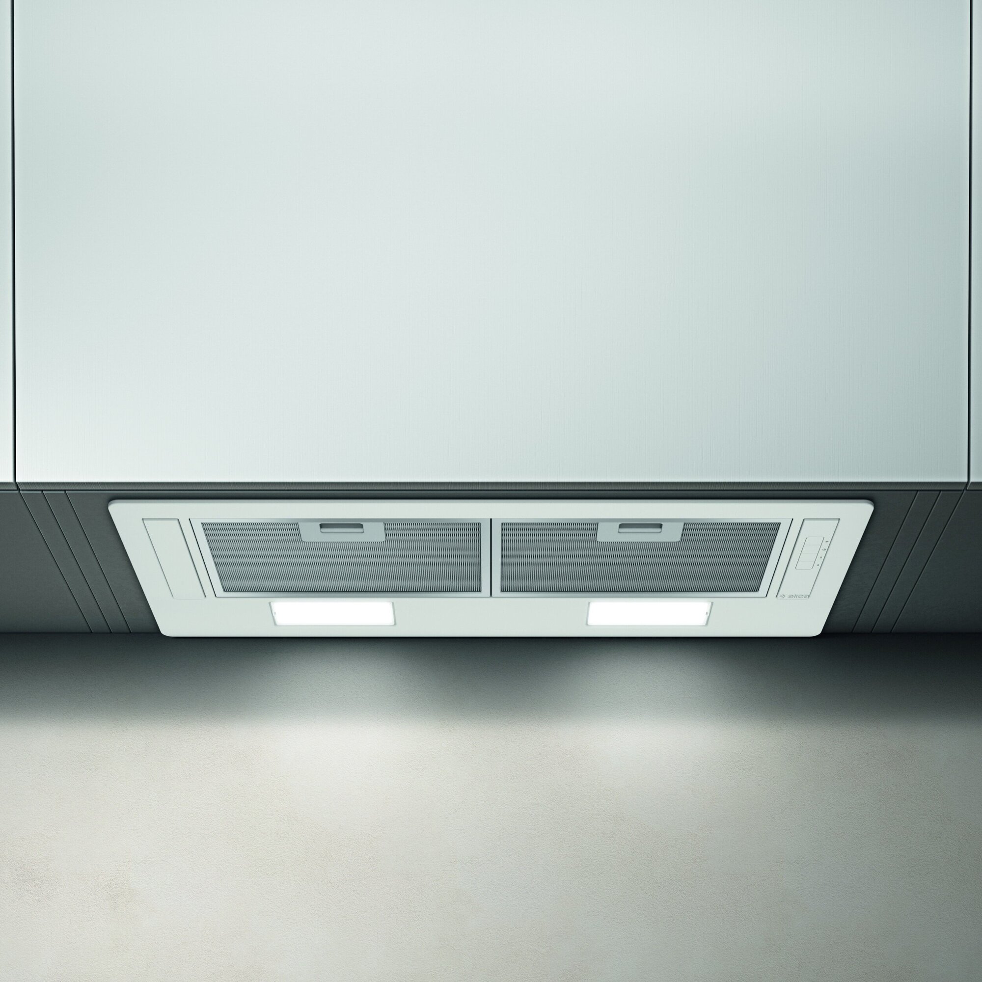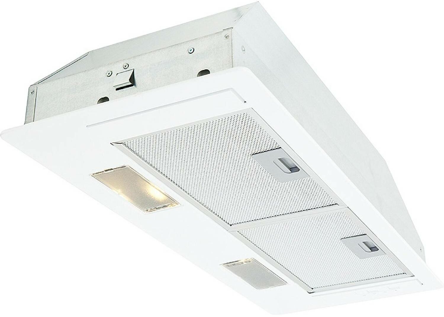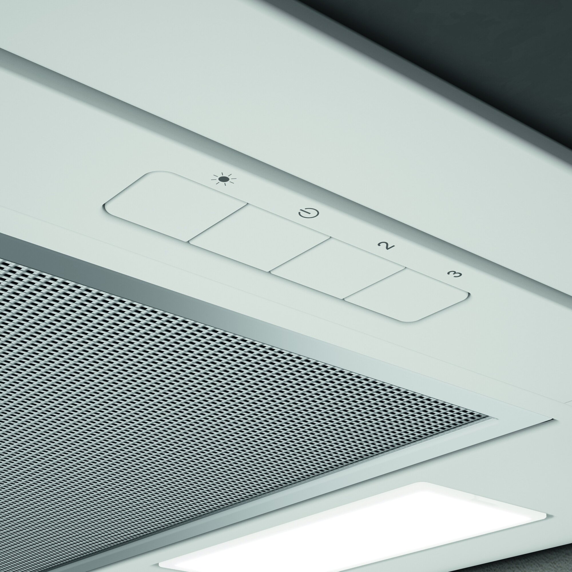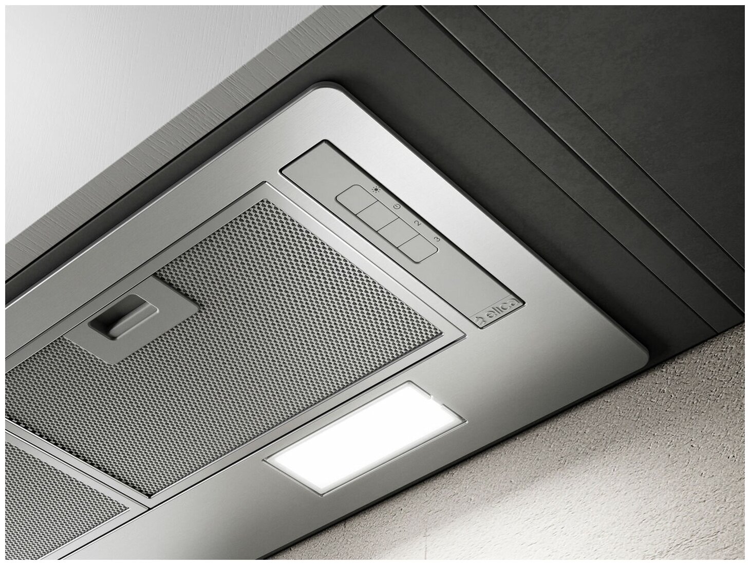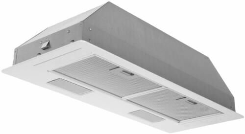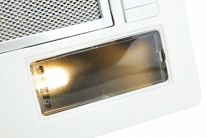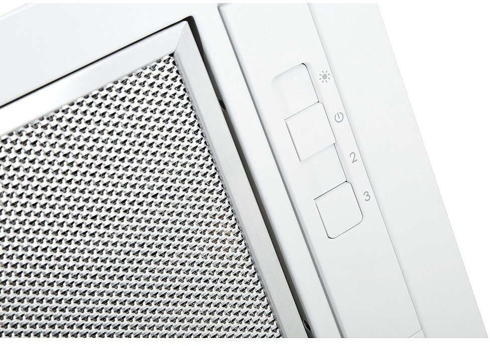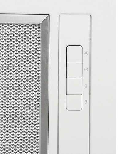 В базовой комплектации вытяжка приспособлена под работу в воздухоотводящем режиме: установлен только алюминиевый жироулавливающий сетчатый экран. Чтобы настроить модель под рециркуляцию, нужно установить дополнительный угольный фильтр. Предусмотрено три режима мощности, максимальный из которых позволяет эффективно очищать воздух на кухне площадью 8-9 кв.м при высоте потолка до 2,7 м.