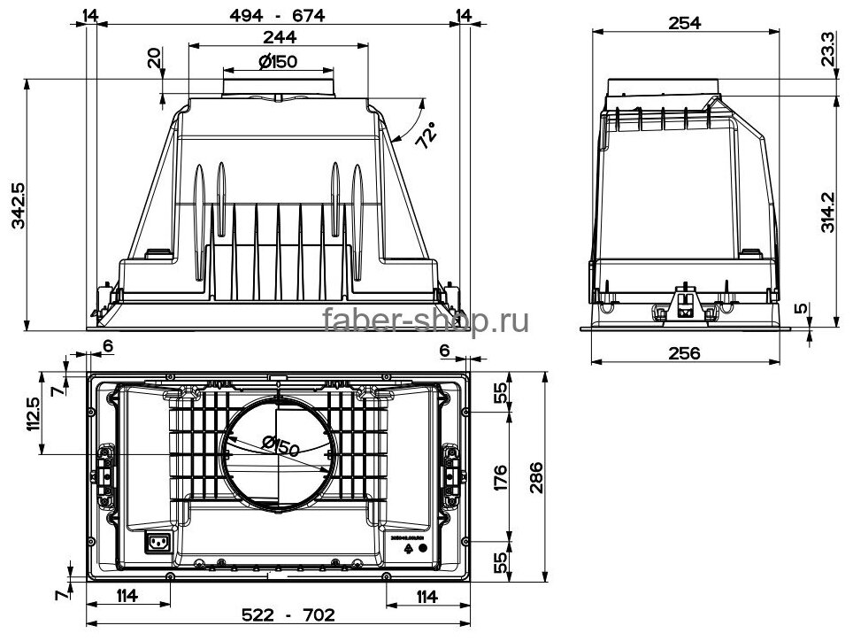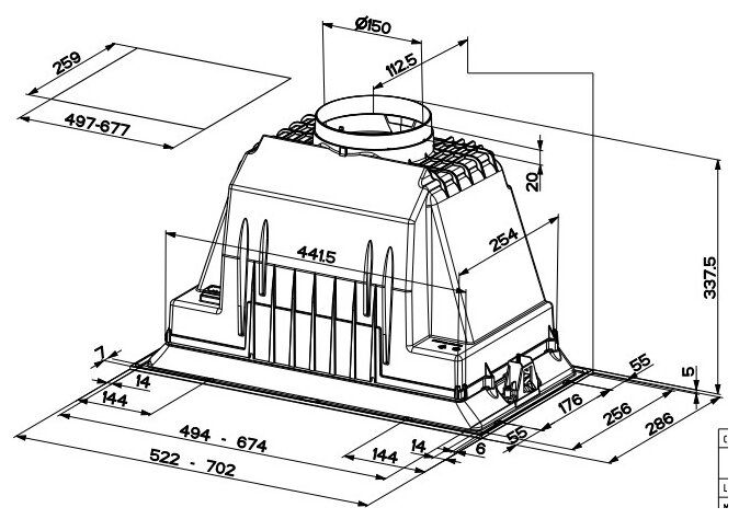 количество ламп освещения: 2; высота установки над панелью газ: 65 см, высота установки над электрической панелью: 45 см,
